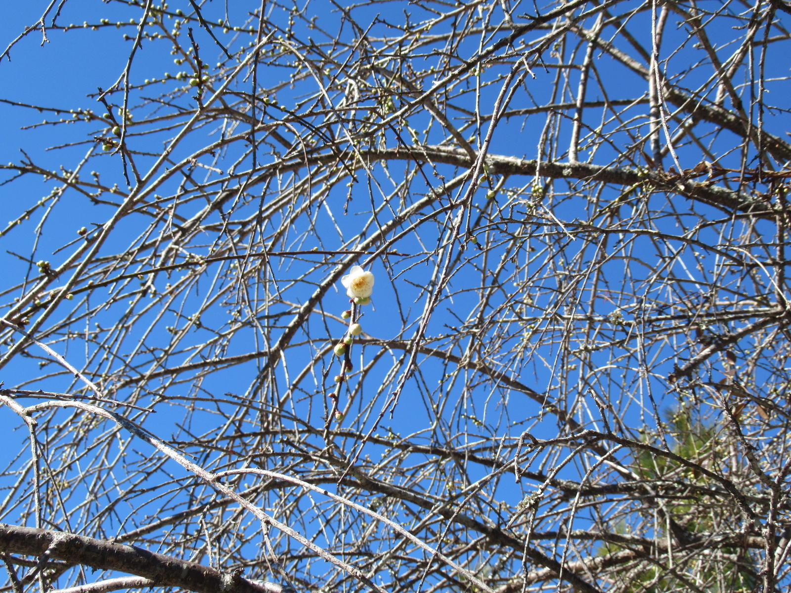 庭の枝垂れ梅が開花。